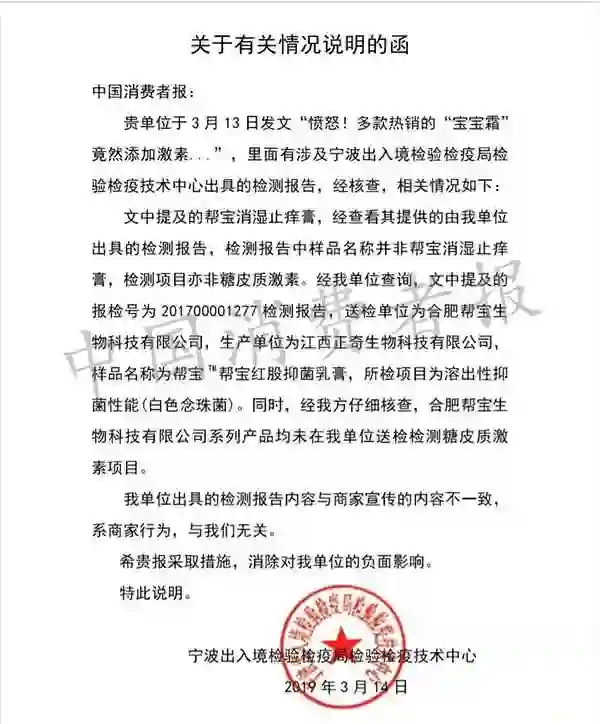 一家从事化妆品成分查询的公司在其微信公号发布多份检测报告,指出淘宝、京东等电商平台销售的6款用于婴幼儿止痒的“宝宝霜”产品违规添加激素。此事经媒体报道后引发关注。