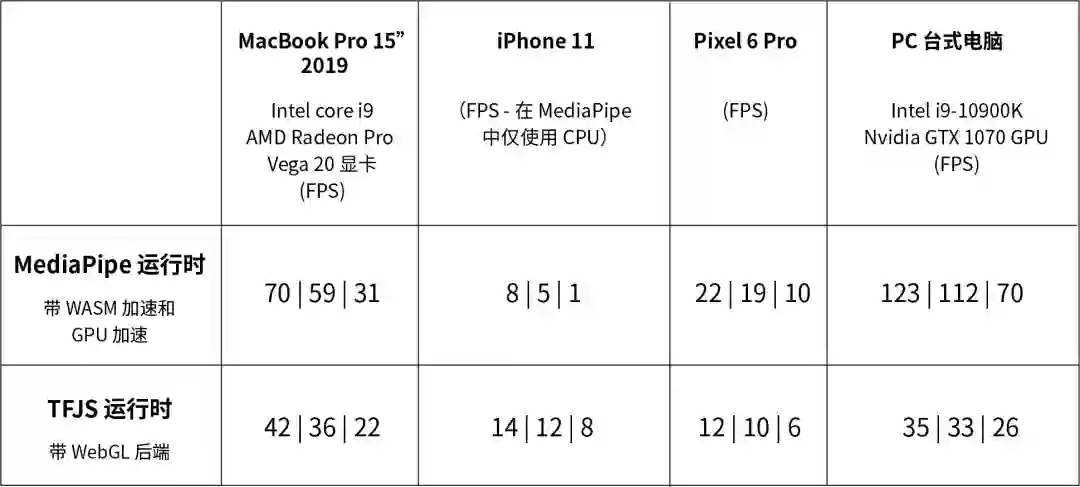 使用每种运行时都有一定的优点和缺点。如下面的性能表所示,MediaPipe 运行时在桌面设备、笔记本电脑和 Android 手机上的推断速度较快,TensorFlow.js 运行时在 iPhone 和 iPad 上的推断速度较快。