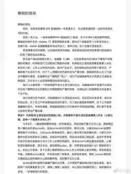 摩拜女员工称遭部门领导性骚扰,同时还有多人受害。该员工自称为2017年8月入职的摩拜SPE前端组女工程师。信中称,摩拜客户端&前端组负责人张耀春对包括自己在内的3名女下属进行性骚扰,利用职权打压违背他意愿的同事。因此决定向公司举报。