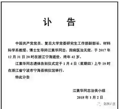 复旦大学党委研究生工作部副部长、材料科学系教授、博士生导师江素华教授,因病医治无效,于2017年12月31日20时不幸辞世。
