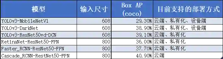各检测模型的效果,以及支持的部署方式如下表所示: