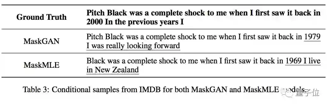 论文也比对了不同方法的完形填空效果。最终他们给出结论:我们用定性和定量的方式表明,与最大似然训练的模型相比,新方法能产生更真实的有条件和无条件文本样本。