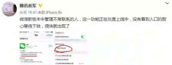 不过部分iOS用户向榜妹反应,更新到最新版本之后却找不到“不常联系的朋友”入口。对此,腾讯公关总监张军在微博上透露,新功能正在灰度上线中。目前,只有被微信官方选中的用户才能第一时间用上这个功能。