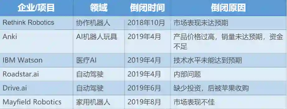 因此,2018-2019 年,商业化落地成为了人工智能从业者及投资者最关心的问题,也正是在这个阶段,一些没能拿出落地产品的公司倒下了,而一些技术大厂的项目也由于种种原因没能撑下去,下表列出了部分 2018-2019 年倒闭的 AI 公司及项目: