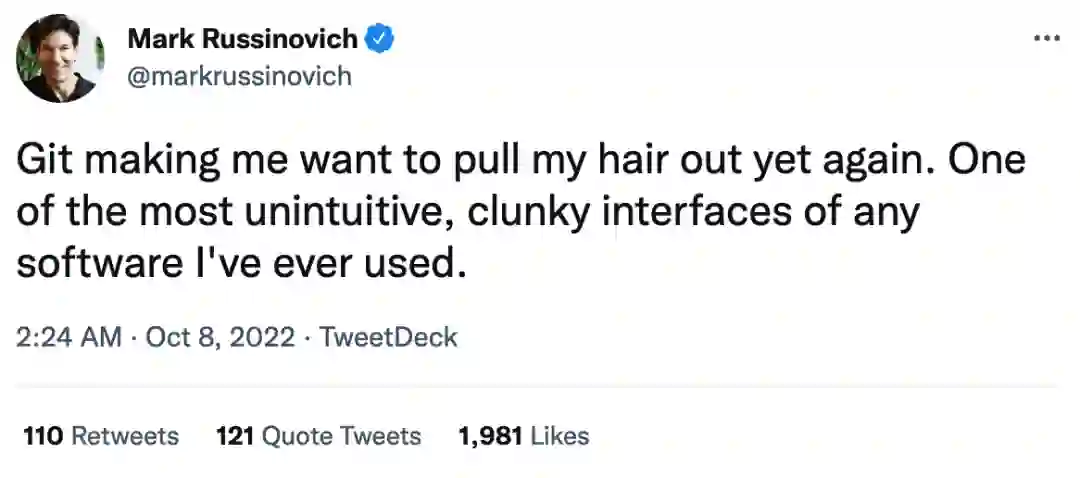 几天前呼吁停用 C++ 改换 Rust 的微软 Azure CTO 这次又在推特上疯狂吐槽 Git,Mark Russinovich 称:“Git 是我使用过的所有软件中界面最不直观、最笨重的,它让我抓狂的想拔掉自己的头发”。