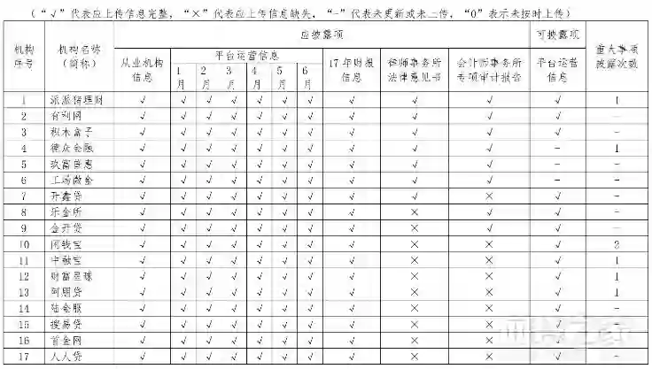 根据披露情况通告,本次披露含应披露项5点:从业机构信息、平台运营信息、17年财报信息、律所法律意见书和会计师事务所专项审计报告;可披露项1点:平台运营信息;另对重大事项披露次数做了统计。
