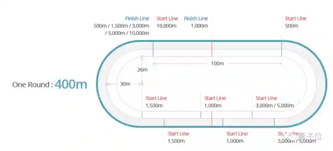 参赛选手两两为一组,在400m长的赛道上角逐,每滑过一圈交换内外道以平衡距离的差异。