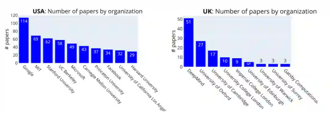 美国有大量的组织,无论是在工业还是在学术界,都有大量的论文。相反,英国的表现是由 DeepMind 领导的,其次是大学。