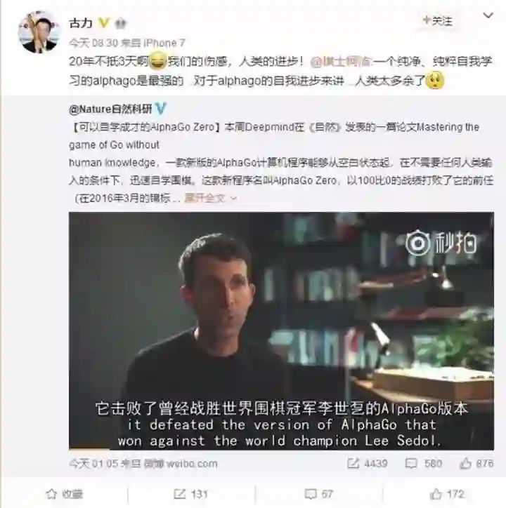 最近几年,人工智能的研究和应用,从语音识别、图像分类到基因组学和药物发现等多个领域取得了快速进展。这得益于大数据和深度学习的有力支持。可以这么讲,这波AI大跃进多是数据驱动的AI,没有大数据的喂养,没有GPU算力的普及化,就没有深度学习的成功。数据驱动的AI离不开大数据,大数据与AI形成一种共生关系:一方面,AI基础理论技术的发展为大数据机器学习和数据挖掘提供了更丰富的模型和算法,如深度网络衍生出的一系列相关技术(深度学习、强化学习、迁移学习、对抗学习等)和方法;另一方面,大数据为AI的发展提供了新的动力和燃料,数据规模大了之后,传统机器学习算法面临巨大挑战,要做并行化、要加速、要改进。当前的弱AI应用都遵从这一技术路线,大数据、深度学习和GPU计算居功至伟。然而,这些利用了大量人力、物力资源和海量数据的AI系统。却很难扩展到通用AI的程度,更不必说超AI了,比如ImageNet的上千万张图片训练出的AI系统,却无法对医疗和自动驾驶领域产生同样重大的作用。需要另起炉灶,重新花大量人力物力进行针对性的数据标注和AI系统建设。类似这些问题,对人类历史经验数据太过依赖,而这种大数据知识成本昂贵,或不可靠,或根本无法使用。因此,Super AI的研究必须要能绕过大数据,通过解码人脑智能学习机理,才能创造出一种终极算法。而阿尔狗元的横空出世,向我们展现了迈向这一目标的可能性。不需要上百万盘历史棋谱数据,仅训练3天(自己左右互搏490万棋局),只需要4片TPU就战胜了旧版AlphaGo 系统,而比分是100:0;旧版阿尔法狗采用了48片TPU,需要花几个月学习几千万盘棋局才完全战胜人类。以致于柯洁面对新版的阿尔法狗元,发表了如下无力吐槽。