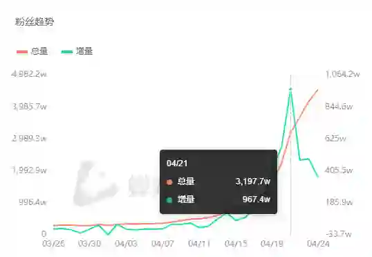 据蝉妈妈数据显示,刘畊宏4月21日一场直播的观看人数达到了5256.7万,这一天他涨粉967.4万。3月26日,他只有296.6万粉丝,而4月25日,他的粉丝数达到了4560.8万。不到一个月时间,刘畊宏实现涨粉超4000万。