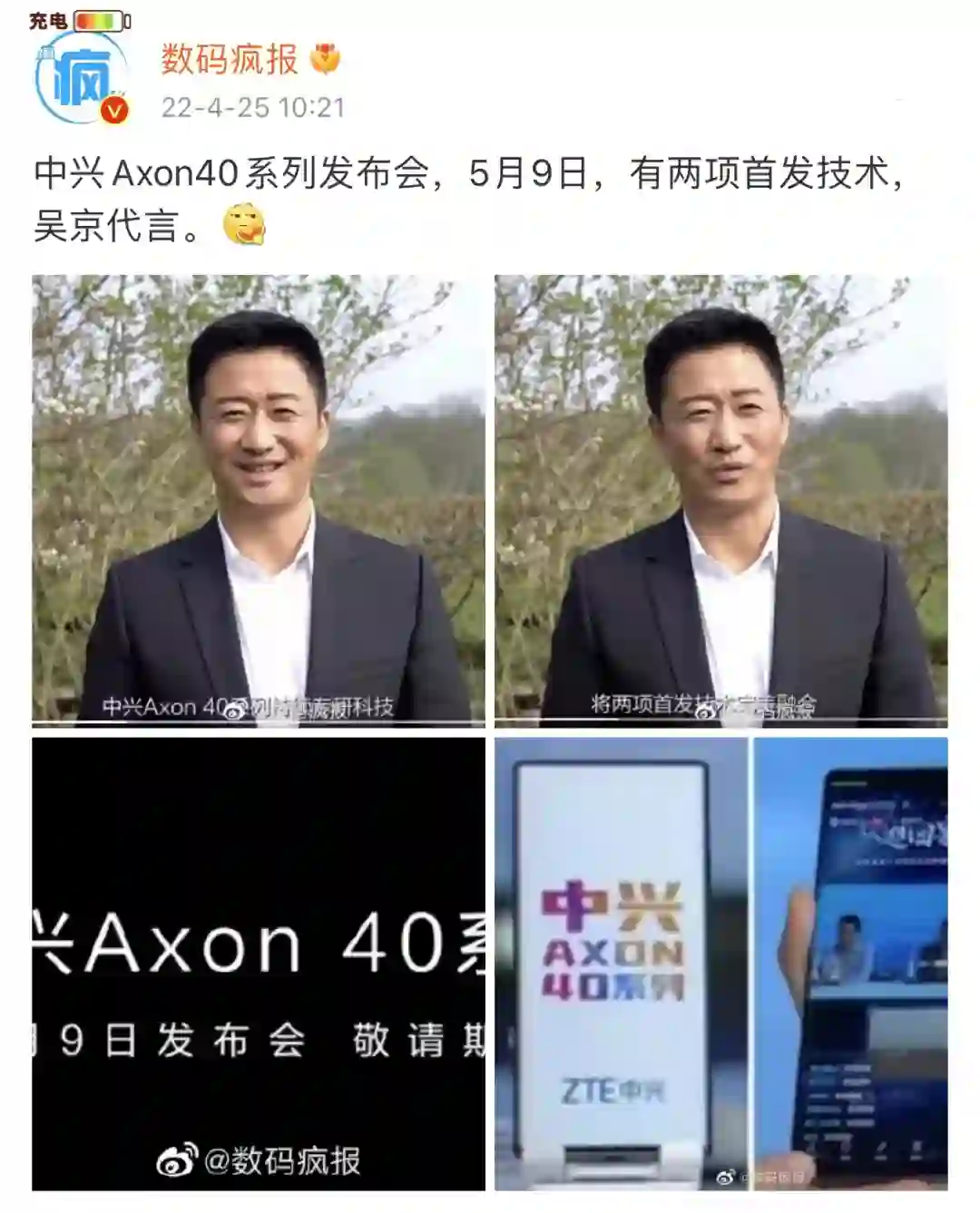 据 @数码疯报 爆料,中兴 Axon 40 系列将于 5 月 9 日发布,由吴京代言,首发两项技术,该系列两款手机都搭载屏下摄像头。中兴官方预热称,Axon 40 Ultra 将是一款直屏旗舰,而且预计会在摄像头方面有所提升,号称“3+1>4”,可能是指上一代搭载 3 颗 64MP 镜头,这一代将有更大提升。