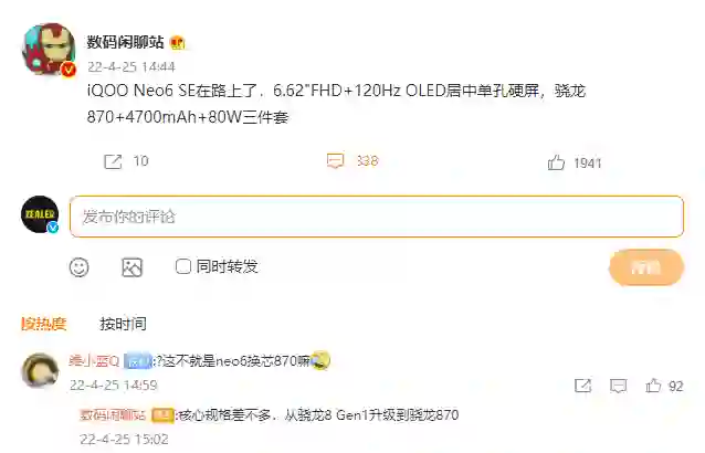 @数码闲聊站 今日透露,iQOO Neo6 SE 即将发布。该机将采用 6.62 英寸 FHD + 分辨率 120Hz 刷新率 OLED 居中单孔硬屏,搭载高通骁龙 870 芯片,内置 4700mAh 电池,支持 80W 快充,核心规格与 Neo6 差不多,只是从骁龙 8 Gen1 升级到了骁龙 870。值得注意的是,iQOO 在 4 月 13 日刚刚发布了 iQOO Neo6,该机配备 6.62 英寸 2400×1080 AMOLED 直屏,120Hz 刷新率,搭载高通骁龙 8 Gen 1 芯片 +LPDDR5 内存+超频版 UFS 3.1 闪存,还有 Pixelworks 独立显示芯片 Pro,售价 2799 元起。