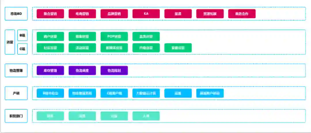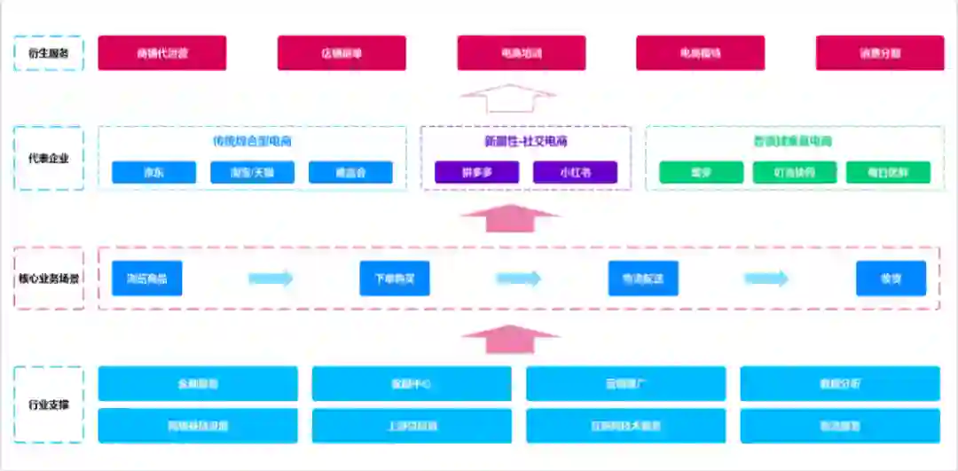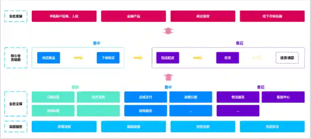 支持业务顺利跑通的部分即为支撑,例如售前的技术支持和B/C端运营等;售中的在线支付、消费服务和消费分期等;售后的物流服务、客服中心等方面。