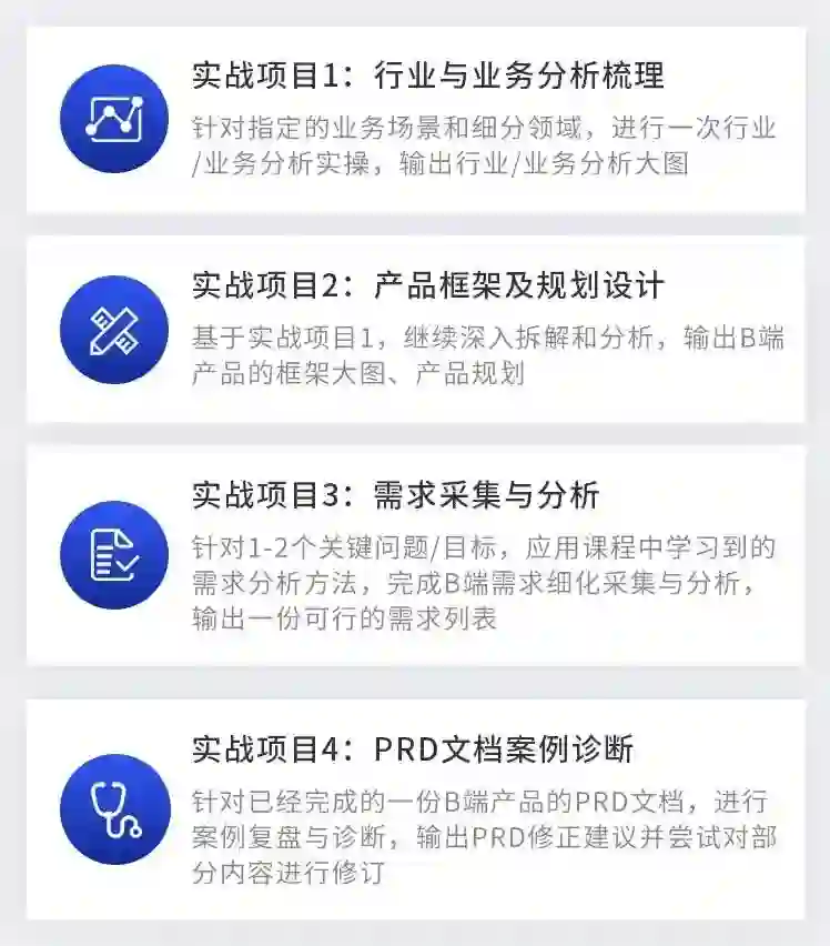 在这个课程中,针对B端产品经理的核心技能模块,你除了日常的基础学习外,还需要依据内容完成如下实操项目,加强知识的内化吸收。