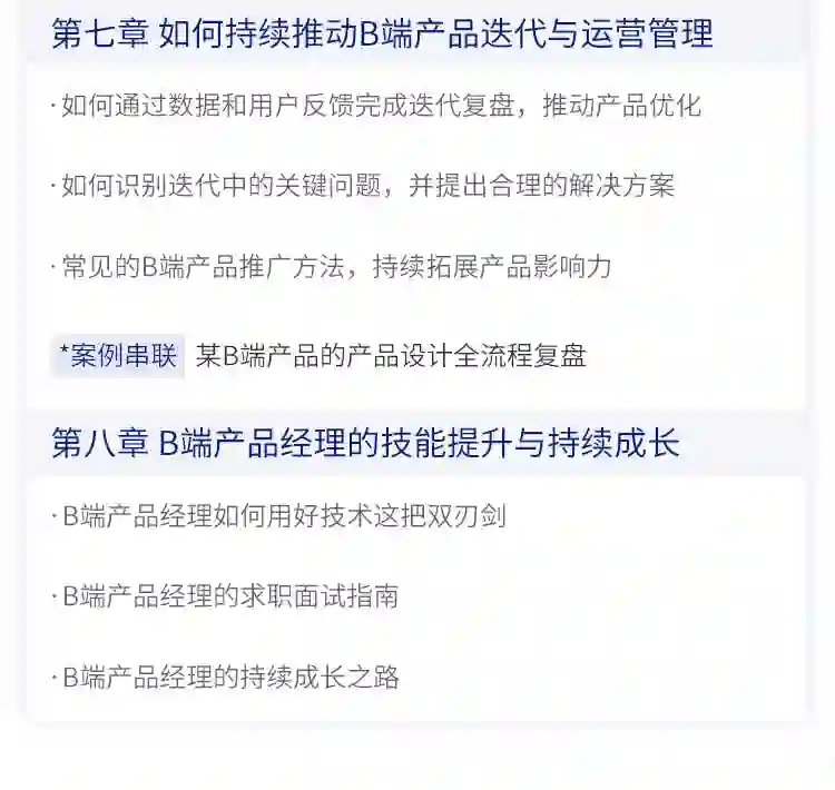 因此,课程会围绕“业务分析梳理-产品框架规划-需求洞察-产品设计”这4个B端产品设计中的重难点展开,再延展包含开发与实施、迭代与运营的工作全流程。