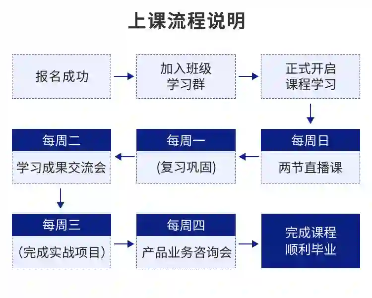 全程直播授课+12场产品业务咨询会+12场学习成果交流会+微信班级群交流;全程由班主任和助教带班,老师全程教学辅导。详细学习流程如下: