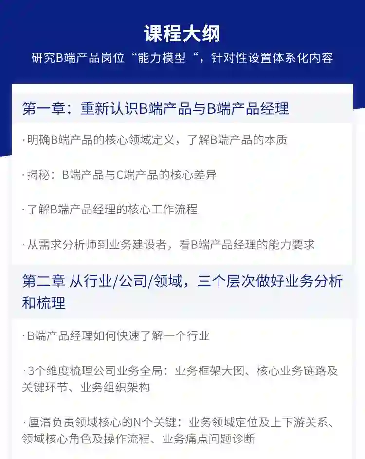 这也是《90天B端产品经理实战班》和其他课程最大的差异,课程将从上至下,带你从一个上层视角更高维度的去理解B端产品的设计。