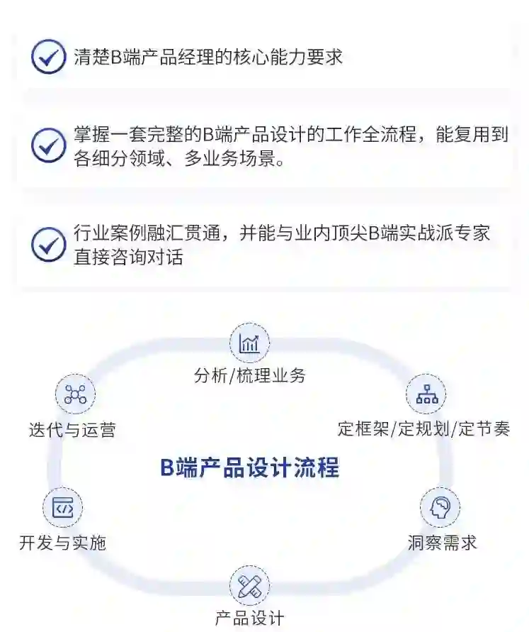 除此之外,B端产品经理除了掌握核心工作技能外,还需要具备极强的抽象能力、沟通协作、技术理解力,这些我们的课程中也给到了可以落地的方法。