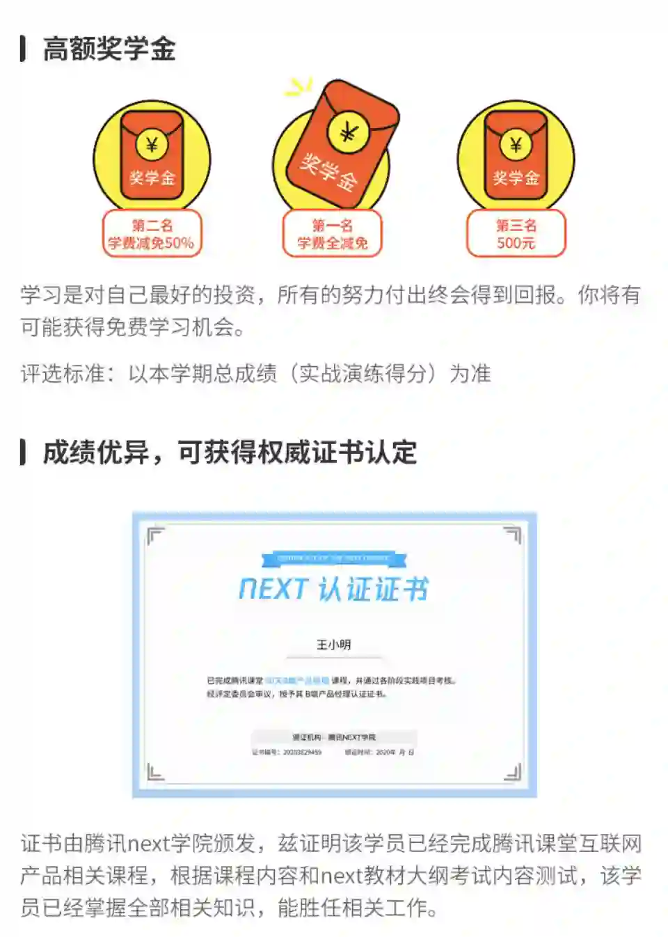 因此本课程还特别申请了高额奖学金,并得到合作伙伴“腾讯课堂Next”学院的认可。