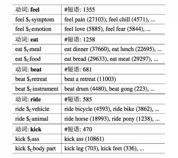 动词模版 本文认为,动词模版可以用来表示一个动词更细粒度的语义。动词模版基于语言学家对单词结合的两个原则设计 [84]:俗语原则(idiom principle)和开放选择原则(open-choice principle)。基于这两个原则,本文设计了两种类型的动词模版: