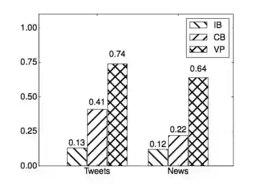在 Tweets 和 News 数据集上,动词模板分别覆盖了 64.3% 和 70% 的动词短语。考虑到在 Google N-Gram 数据中的拼写错误以及解析错误,这样的覆盖率是可以接受的。图 4.2 展示了本章方法以及基准方法提取的动词模板(VP)的查准率。结果显示本章方法相比于基准方法在精确度方面有很大的提升。结果同时显示了对于动词的语义理解来说实体概念化模板与俗语模板都是必要的。
