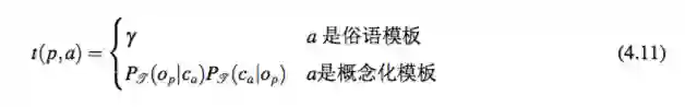 更形式化的,对于一个确定的动词短语 p,定义 t(p,a) 衡量模板 a 相对于动词短语 p 的典型性。如果 a 是俗语模板,t(p,a) 被设置成一个常数 γ。如果 a 是实体概念化模板,使用 op 相对于 ca 的典型性定义 t(p,a),这里 ca 是模板 a 的概念。特别的有: