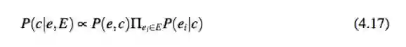 本节的方法 本节在上下文中增加了动词作为附加信息来实体概念化 e。当 e 是一个动词的对象的时候,利用动词模板可以推导出 P(c|v),即在给定动词 v 的动词短语下观察到有关概念 c 的实体概念化模板的概率。因此,在给定上下文 E 和实体 e 还有动词 v 的情况下,概念 c 出现的概率是 P(c|e,v,E)。类似于等式 4.17,P(c|e,v,E) 可以通过以下公式来计算: