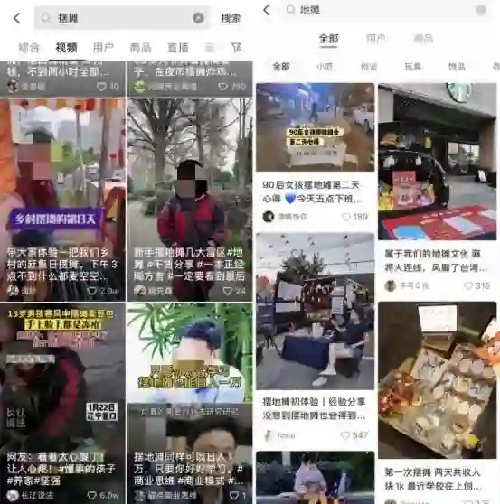 当你在小红书上搜索“地摊”二字时,就有超过35万条笔记;在抖音搜索“摆摊”,话题下的播放量甚至超过150亿次;而在贴吧和豆瓣,年轻人们如数家珍的品鉴着“地摊萌新教学”“地摊货源评测”“十年地摊大神经验分享”这样的干货帖子。