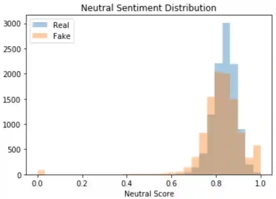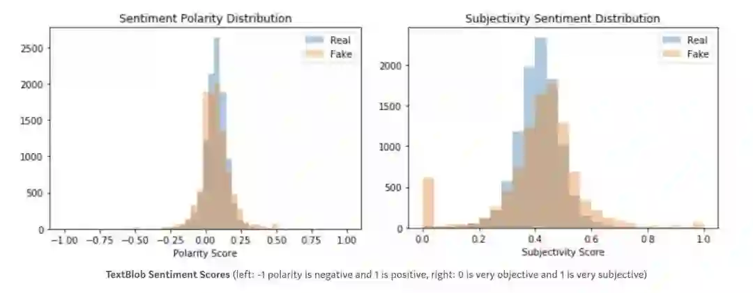 情感分析是 NLP 中的另一种分析工具,它可以量化文章中的情绪并评分。我们在这里使用了两个包,TextBlob 和 Natural Language Toolkit 的 Vader 。它们都是分析文中情绪的工具。 Vader 会针对文章的偏激性和中立性进行测量和评分,而 TextBlob 则会测量文章的偏激性和整体主观性。我们原本猜想这些情绪分布会根据文章的真实性和误导性有大幅变化,但在实际情况中我们发现这种差异并不明显。