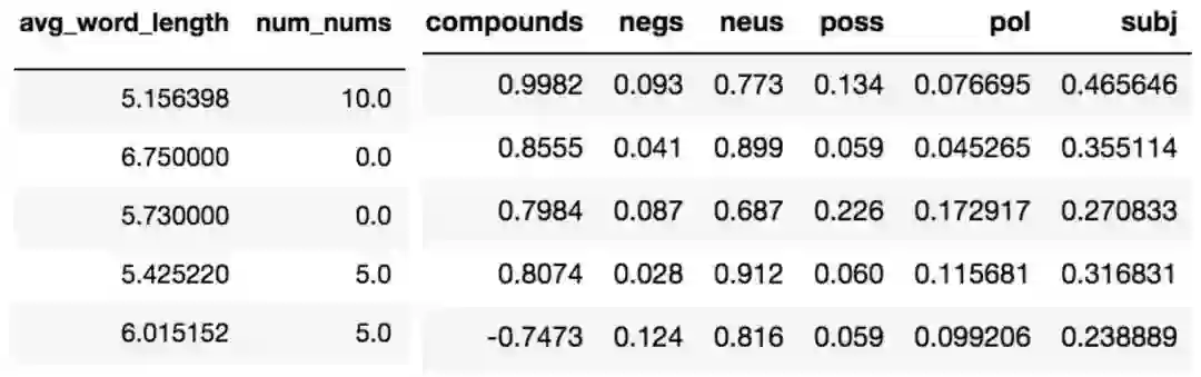 特征工程是不一个简单的技能,它更像是复杂的艺术形式。 它包含了考虑数据集和域的过程,选择对于模型最有用的特征,以及测试特征以优化选择。 Scikit-learn 的矢量化器提取了我们的1000个基础的 n 元语法( n-gram ) 特征,同时我们开始添加元特征来改进我们的分类。我们决定计算每个文档中的平均单词长度和出现数字的次数,以此提高我们模型的准确性。