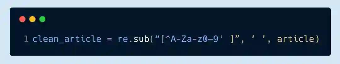 在大部分以数据为主体的项目中,第一道工序便是数据清洗。在鉴别虚假新闻时,我们需要处理成千上万篇来自不同领域、有着不同清晰度的文章。 为了有效筛选需要的内容,我们使用正则表达式来提取分析中所需要的字符串类型。例如,这是一行使用 re python 模块的代码: