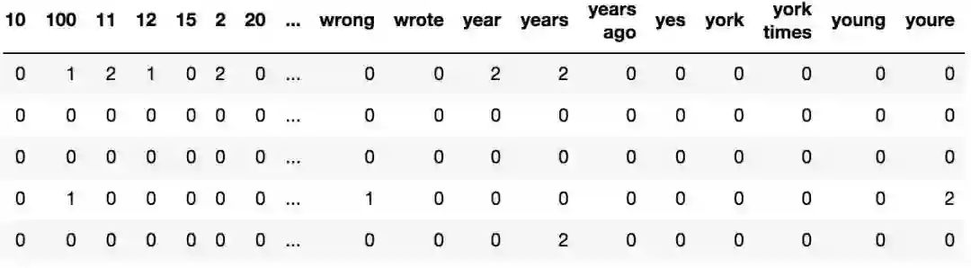 Scikit-learn 是一个令人惊叹的 python 机器学习包,它能承担很多繁重的工作。 特别是 Count Vectorizer 这个函数,它能创建所有被分析文本的完整词汇表,并将每个单独的文档转换为表示每个单词总数的向量。 因为大多数文章并不会包含词汇表里的大部分单词,函数将返回一个稀疏矩阵形式的向量。 矢量化器则允许我们对各种预处理函数和首选的标记器进行集成。