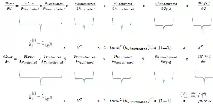 由于RNN中存在三个权重,因此我们需要三个梯度。input_weights(dLoss / dU),internal_state_weights(dLoss / dW)和output_weights(dLoss / dV)的梯度。