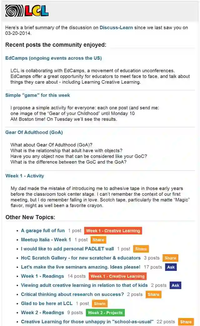 你想要一些事能占据邮件列表和在线讨论区之间的空区。你应该能够订阅每个帖子到来时的邮件通知,或者通过 Web 查看在线对话。每个人应该能获得每周或每日的自动摘要。