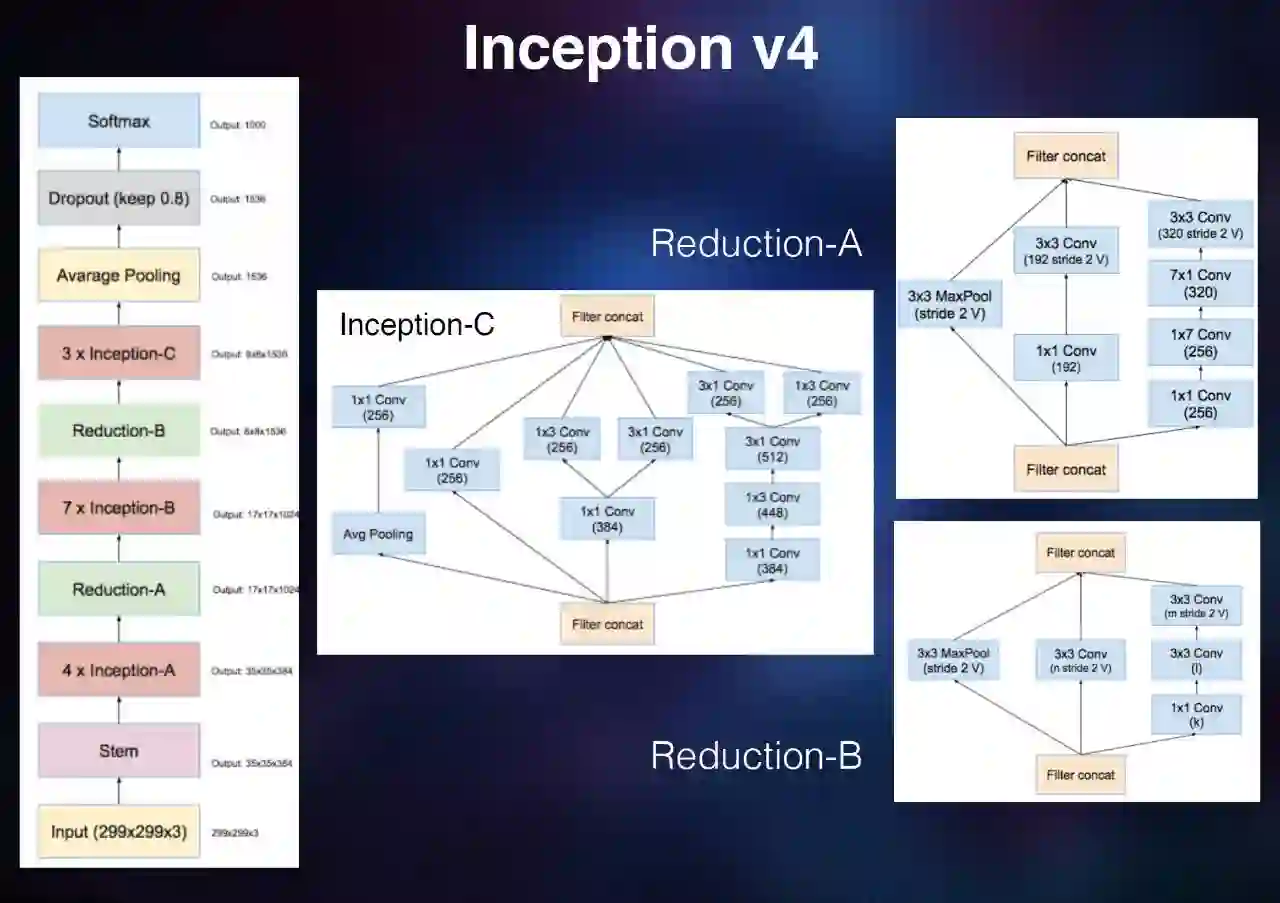 后来,谷歌的人觉得,我们要说明我们的 Inception 网络结构一样可以做得很深,一样可以做到很好。这就有了 Inception V4。