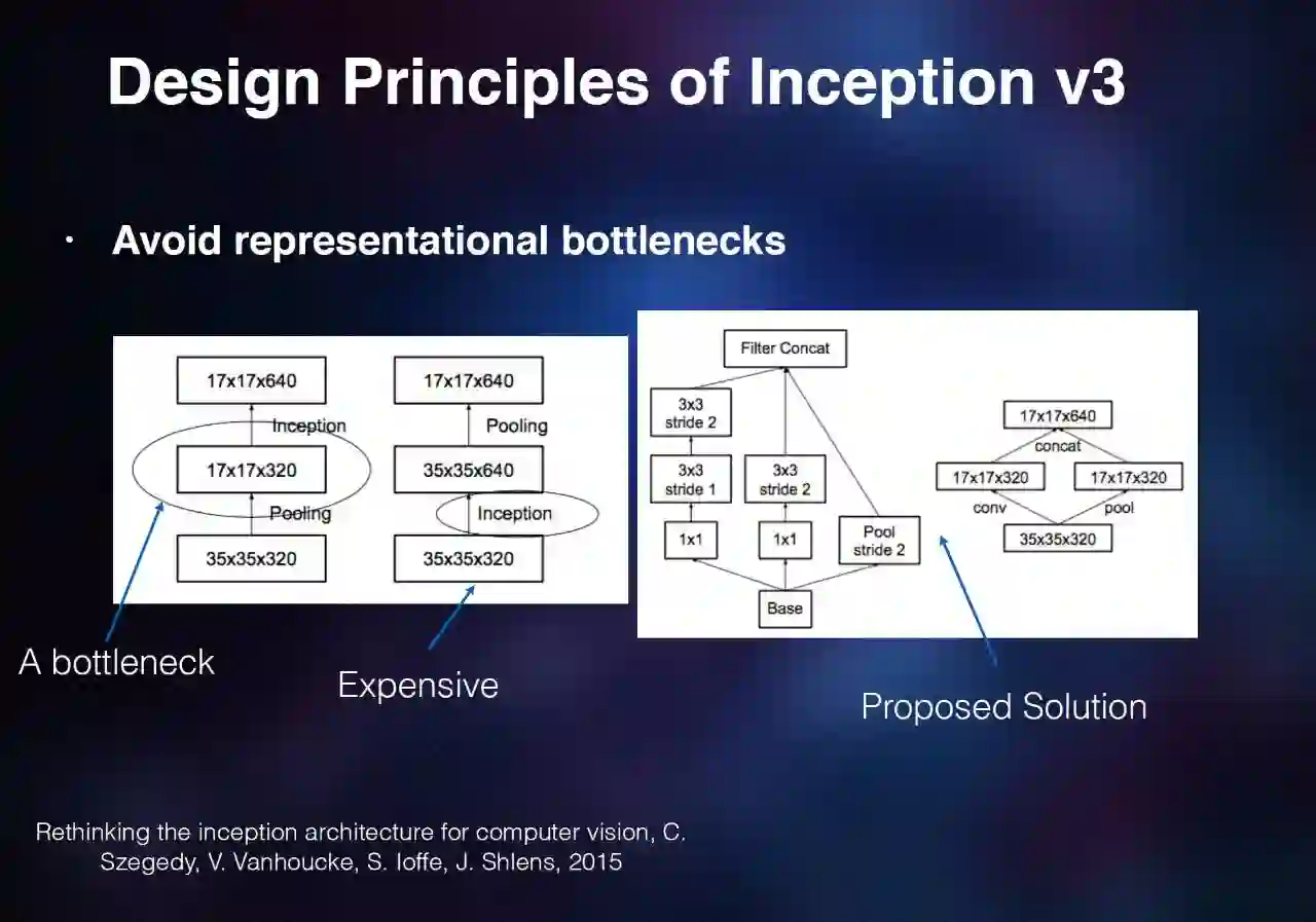 怎么去解决?首先左边这一个结构是用 1×1 的去降维,这样缩小 feature map 的个数,再统统去做卷积,另外就是说我可以把它拆成两个并行的小网络,左边是 17×17×320,右边是 17×17×320,然后把它们拼在一起,结果还是 17×17×640 个 feature map。但是中间那两个小网络是并行的,它们的参数是相加的关系,能够容纳信息的量也比原来的 17×17×320,翻了两倍。通过这种方式同时保证了参数不是特别多,也没有信息瓶颈。这是他们当时关于设计网络结构的思考。