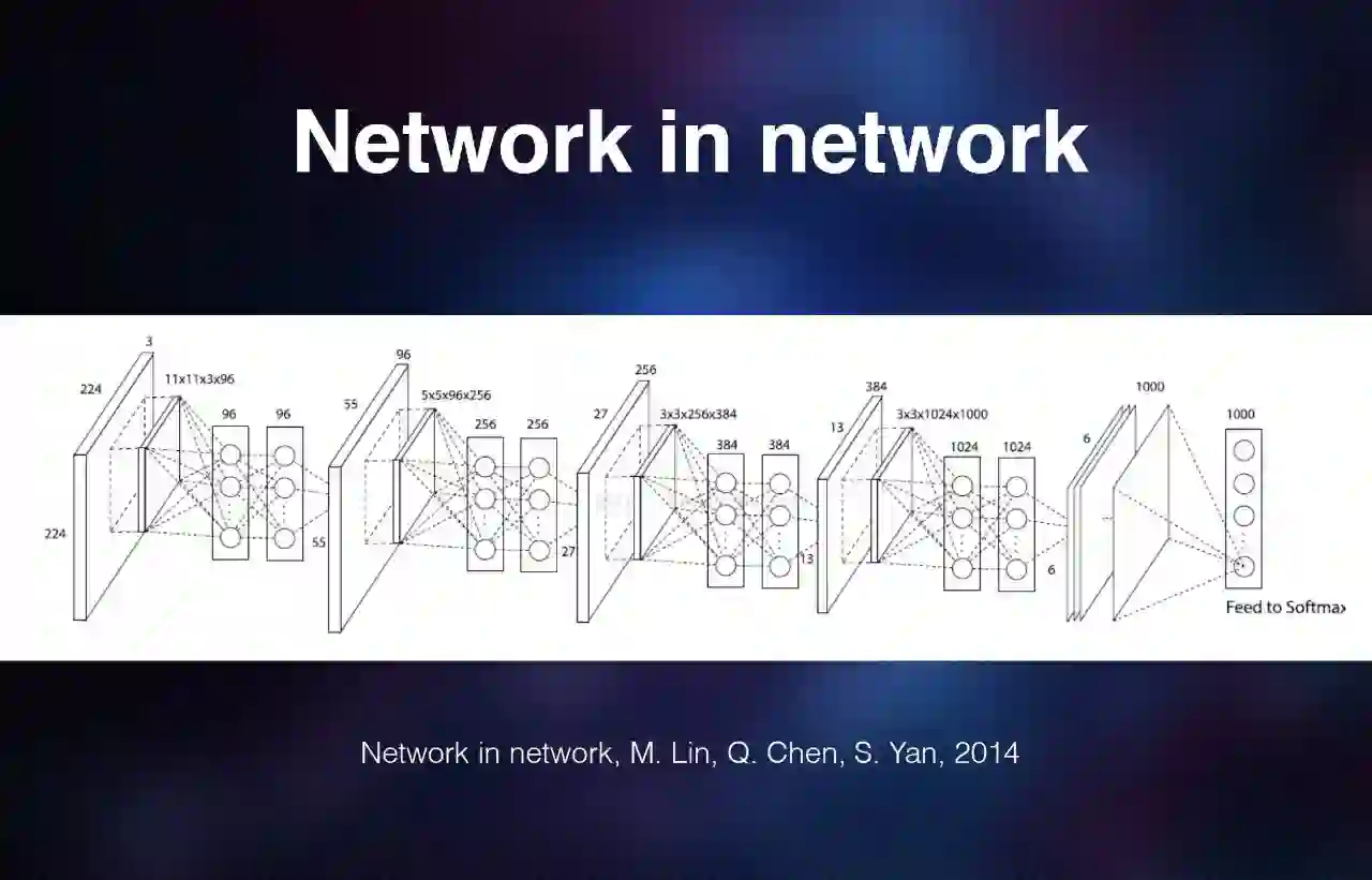 之前的网络是一层一层去卷积,还是比较规则的。而颜水成做的工作是设计一些小的网络。大的网络是由一些小的网络来组成的。小的网络,比如 11×11 的卷积,在卷积之后加了一些 MLP,多层的 Perceptron,就是说每个输入层跟输出层都是全连接的、线性的网络连接。