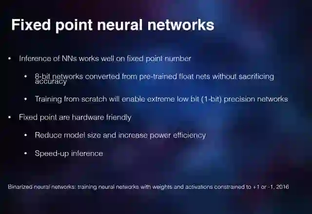 所以这一个工作是把这个网络定点化,第一步主要是把这些参数进行量化,这一系列的工作我觉得到极致了,就是可以 binary——二值化的网络。如果你把网络结构每个参数、每个权重都二值化,这样就非常非理想,适合用硬件去实现,而且效率就会高很多。