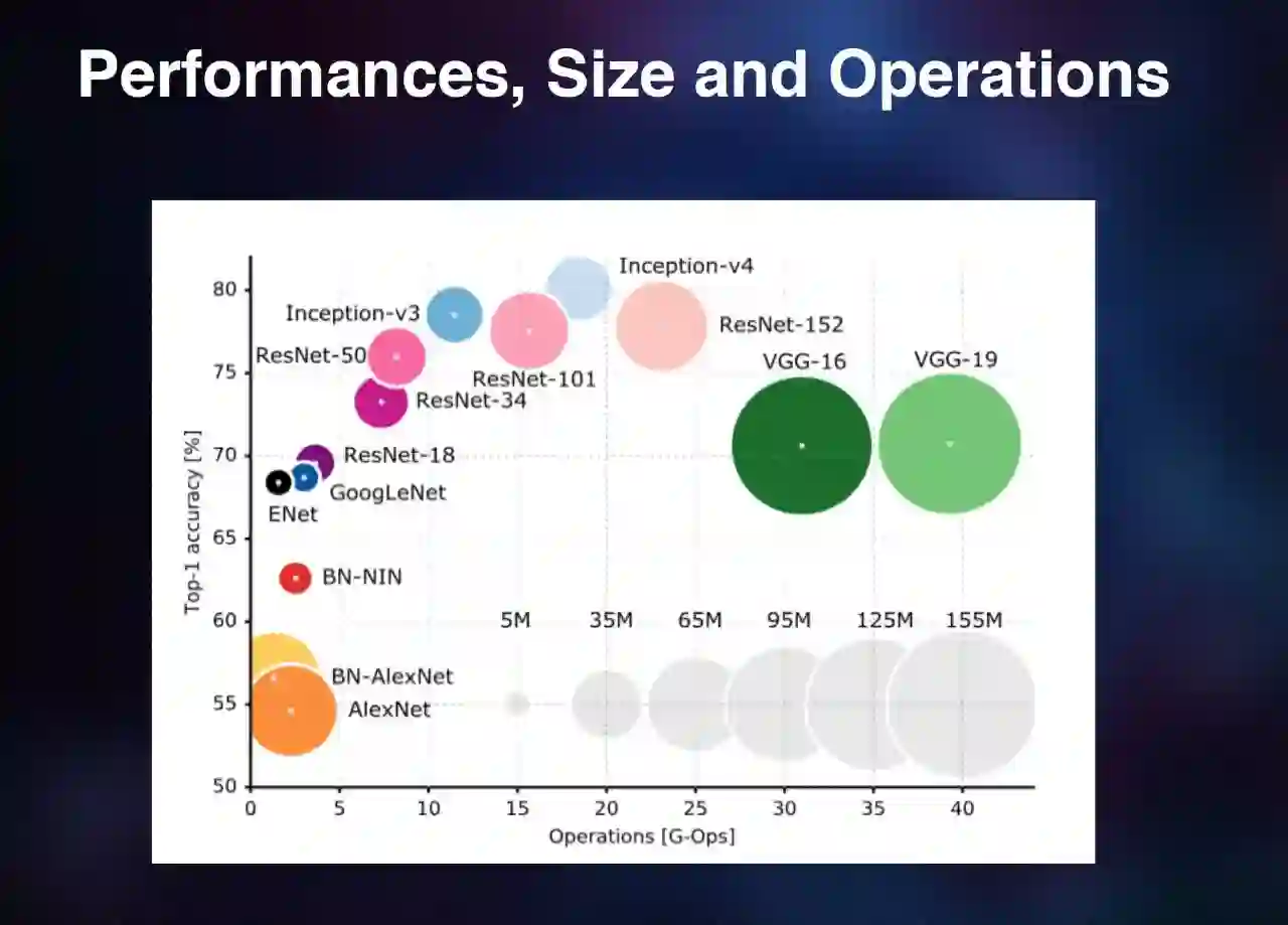 稍微总结一下。至少在 ImageNet 上,设计神经网络时要考虑以下因素。一个是性能,就是准确度怎么样;一个是网络模型的大小,就是有多少参数;一个是运算量,就是有多少个 operation。下面的图就把刚才提到的所有网络结构做了一个很好的总结。