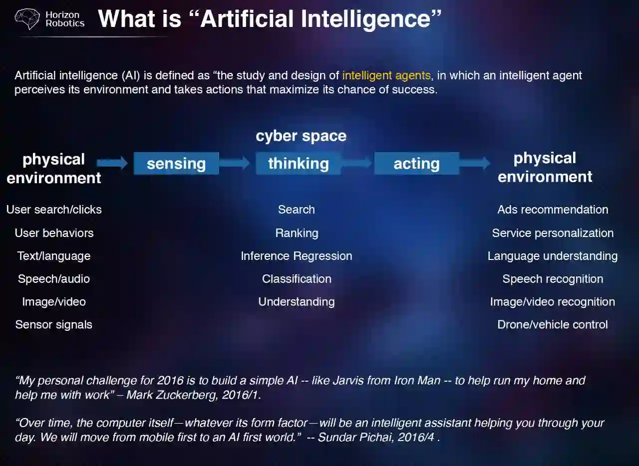 如果我们做的工作跟某一个阶段相关,我觉得这也是属于 AI 的研究。这三个环境包括 Sensing 、Thinking、Acting,也包括了很广的概念。比如说 PC 上网,敲键盘打字,是把物理环境的信息输入到了数字世界中,在比如当摄像头、麦克风,还有在汽车中的激光雷达或者是其它的传感器,这些设备把我们物理世界的信号转换到了计算机能够处理的信号。在计算机的处理中,可以对这些数据进行分类、搜索、排序,这些都是理解的过程。再之后,我们对这个世界有一个反馈,包括可以根据搜索的内容,建议一些广告,或者是对于语言的理解之后,比如说要打车哪里,它可以自动给你导航,也包括图像或者人脸识别之后,也许可以让大家找到你的名字,找到你的一些偏好,做一些科学化的设置,包括像无人机、无人车可以根据信号自主避障、寻径,这是反馈到物理世界进行控制。这些都是人工智能研究的方面。