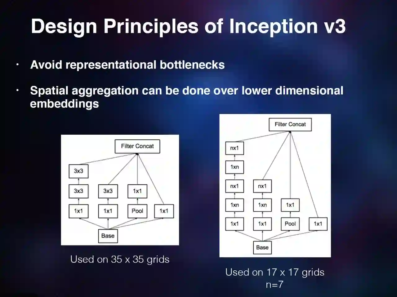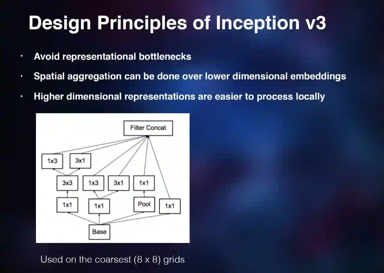 所以你最好有些小卷积核,可以总结很多空间上的信息。他们当时在最后几级 8×8 的规则上面是用这种很小的卷积核。