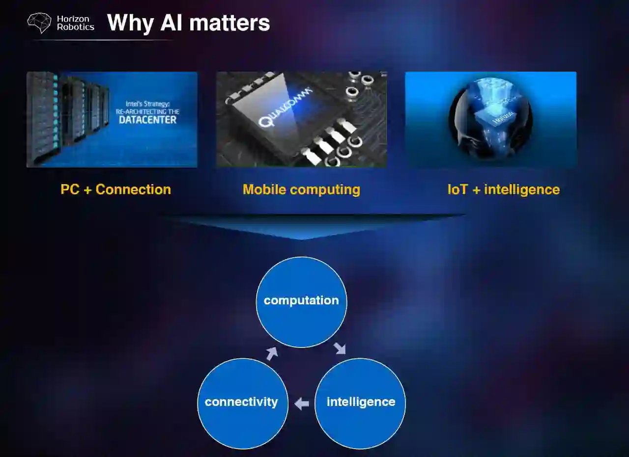 我们公司叫做地平线机器人,但是我们对机器人的定义稍微有点不一样。我们其实并不特别关注那些长得很像人的,有手有脚,能跑能跳的机器人。我们认为只要是一个机器,有感知环境,自主决策的功能,慢慢就发展成机器人。我们业务或者努力方向,更多是把大家生活中的设备变得更聪明,慢慢向机器人的方向发展。这是我们希望做的事情和正在做的事情。
