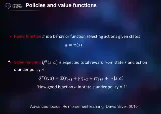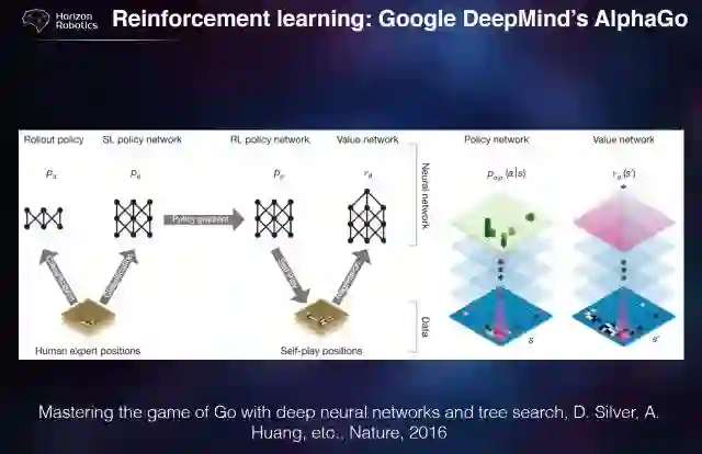 这些概念其实都是早就有了。现在 policy function 和 value function 本身就是比较复杂的函数。用深度神经网络去模拟深度的 DNN,让 DNN 去模拟去近似。最著名的应用是在 AlphaGo 里了,我就不多讲了。它将 policy network 和 value network 都用 CNN 去表示、去近似。