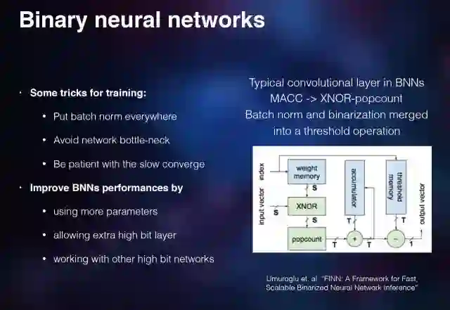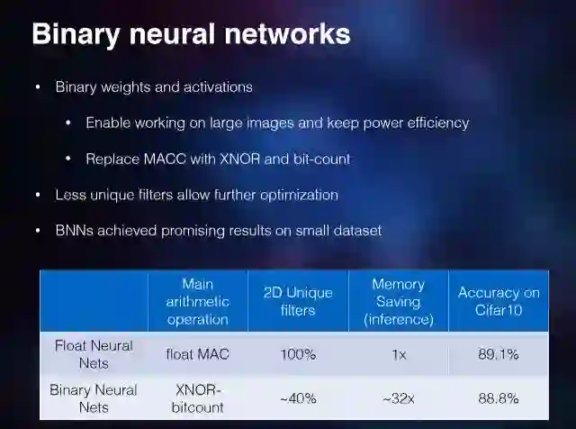 有一些比较新的工作证明至少目前在一些小的集合上,比如 Cifar 10,它的性能跟浮点是很接近的。它的存储空间可以想象一下,如果从 32 位浮点直接变成二值,大约是能够简化 32 倍了。