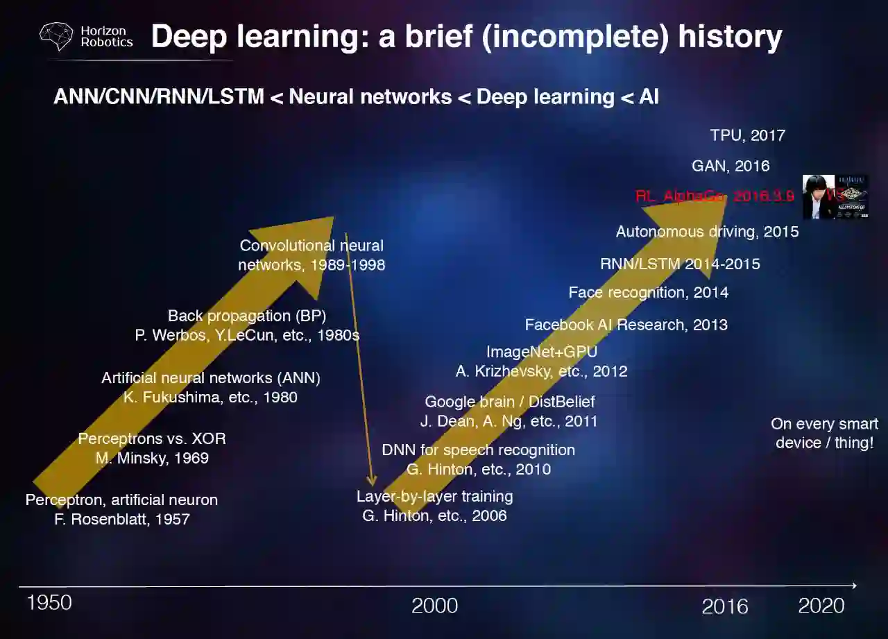 2016 年的 AlphaGO,基本上算是横空出世,一下子就把 AI 从学术界推到了公众领域中,做了一个很好的科普。2016 年、2017 年其实还在迅速的发展,包括 2016 年之前就有的对抗生成网络,2017 年谷歌刚刚公布了用 TPU 芯片方式做成网络的结构。他们应该是 2015 年就做出来了,估计这个 TPU 不是他们第一代的产品,估计是把第一代的架构公布了,现在已经做第二代。