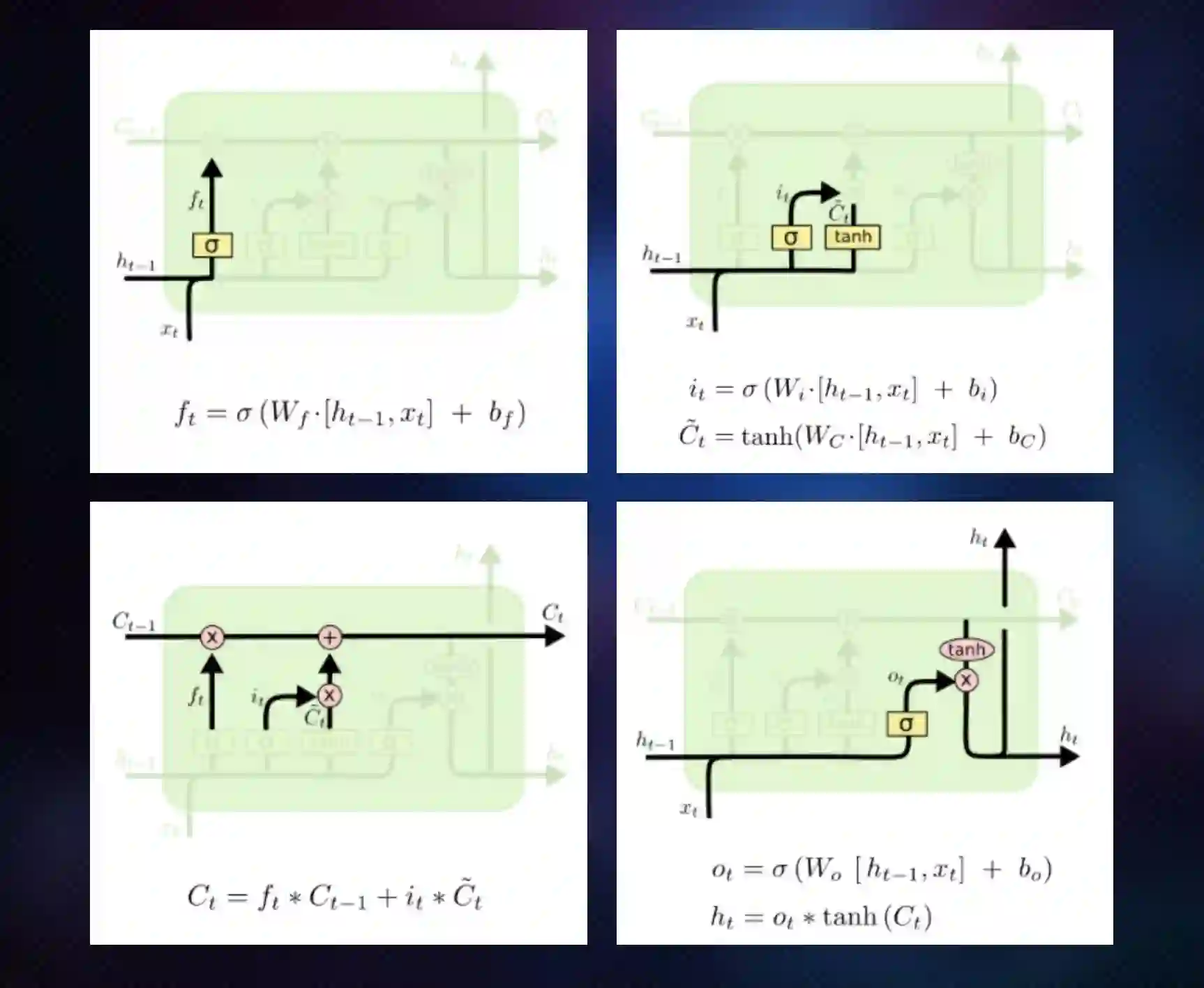 首先,你有一个输入,就是上一个时刻的输出跟现在时刻的输入来决定你有多少信息会继续保留在这个单元,叫 forgetting gate,在这里是 Ft。下一个需要的是上一时刻的输出和现在时刻输入来决定当前的内容,就是 Ct。C 是 cell 本身的内容,意思是有多少信息是继续保留。所以通过那个 [Ht-1,Xt],算出来一个 It 那个 Sigma 就是 whatever 一个函数了,一个 activation function。Wt 是某种意义上你会学到一个 weight,一个矩阵。重要是 Ht-1 跟 Xt 决定了一个 it,it 去决定 Ct。也就是说什么信息能继续保留下来。ft 是指需要多少记忆去忘记,它和 Ct 这一时刻,这二者会做一个线性组合去决定 Ct,决定继续保留在这个时刻这个单元里的信息内容。最后还有一个 Ot,就是输出的 gate,就是说决定一下 Ht-1 跟 Xt,去学习一些参数,去决定哪些作为下一个时刻输出。