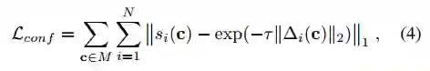 如上所述,回归流还输出每个预测关键点的置信度值si(c),其通过网络输出上的S形函数获得。置信度值反映预测的2D投影与真值的接近度。描述如下:
