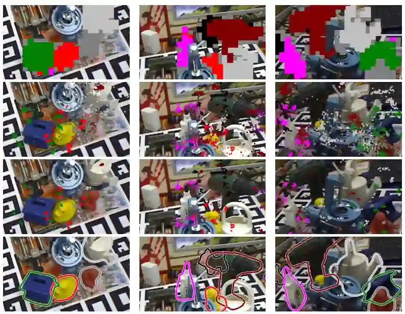 ADD误差是三维位姿误差。由估计的三维位置和姿态与groundtruth间的误差。在每列中,我们从上到下显示:前景分割mask,所有2D重投影候选,所选2D重投影和最终姿势结果。即使存在大的遮挡,我们的方法也能生成准确的姿态估计。此外,它可以实时处理多个对象。