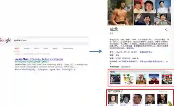 在图 1 中,当用户输入“jackie chan”,搜索引擎可以识别出 jackie chan 其实就是成龙,而且,会给出成龙的各种属性信息,比如说出生日期、国籍、配偶等。这些都是以前基于关键词的检索做不到的,有了知识图谱以后,就可以即问即答了。点击成龙的配偶“林凤娇”,可以直接进入她的知识卡片,见图 2: