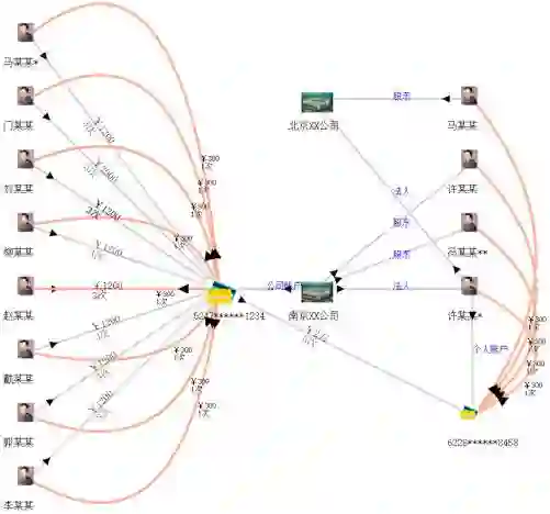 辅助公安刑侦、经侦、银行进行案件线索侦查和挖掘同伙。比如银行和公安经侦监控资金账户,当有一段时间内有大量资金流动并集中到某个账户的时候很可能是非法集资,系统触发预警(图 4)。